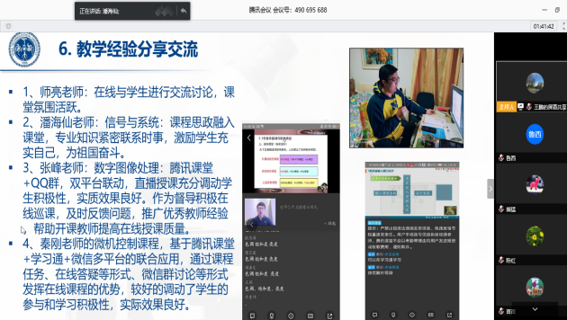 师亮老师重点介绍了录制慕课视频以及选择平台的经验,推荐使用主流教学软件和平台工具,保证已有教学资源的完整性。潘海仙老师将疫情期间“云监工”“远程会诊”等元素与专业课程知识紧密结合,激发员工民族自豪感;她建议大家在授课中融入课程思政,将德育与智育相结合,引导员工为国家富强和民族振兴做出贡献。张峰老师强调了课程教学设计和课堂师生互动的重要性,分享了授课过程中好的经验,极大地调动员工学习的主动性和积极性。秦刚老师作为校级咨询督导,分享了自己巡课后的体会,他提出,在线教学是开放的教学,各位老师在授课中要注意着装、言语得体,注意上课细节的把握,提高课程展示能力。