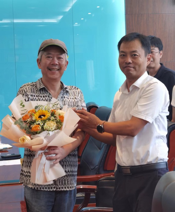 最后,易超书记代表公司为两位退休教师赠送礼物和鲜花,全体参会教师与两位退休教师合影留念。