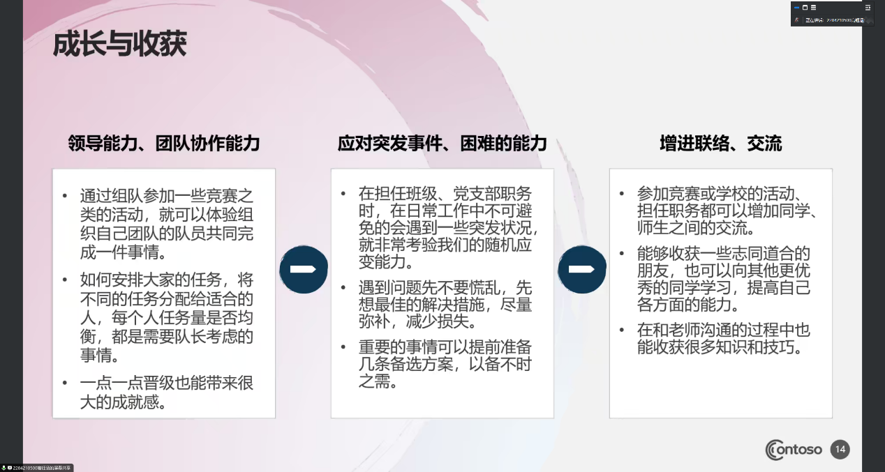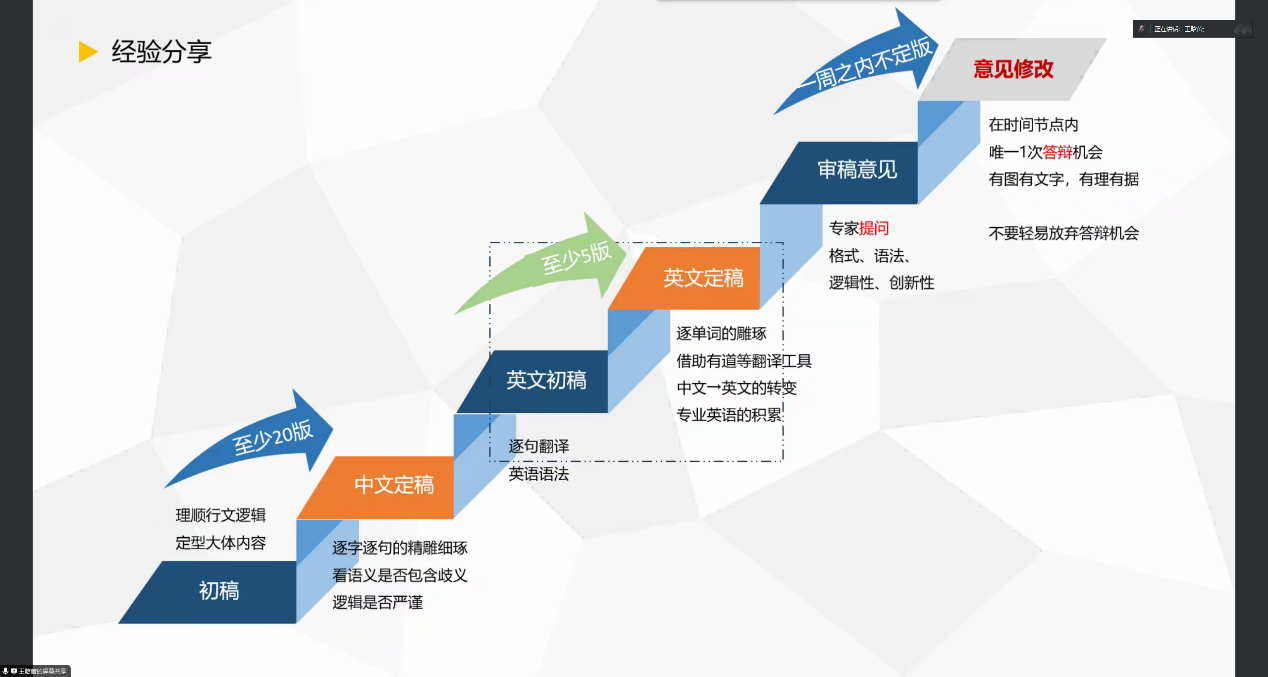 孙天誉分享了他在获奖和求学过程中的感悟和心得,鼓励大家坚持努力学习,不要迷茫,相信只要付出努力就能取得优异成绩。王晗蕾分享了她在英文论文投稿方面的经验,包括修稿过程和处理审稿意见的技巧,并强调了提出高质量问题和寻找创新点的重要性。最后,高钰涵同学分享了她获得国家奖学金的学习经验,重点强调了研究生阶段学业的重要性,分享了课程复习技巧,以及担任员工干部和参与竞赛所带来的成长与收获。